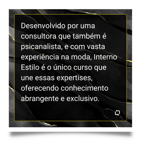 Um curso que me transformou e mudou meu olhar para uma série de questões. O curso do Interno Estilo está entre os melhores que já fiz! Somos uma categoria profissional que toca a alma e a vida de muitas pessoas. Não podemos nos dar ao luxo de ser levianas ou ingênuas
