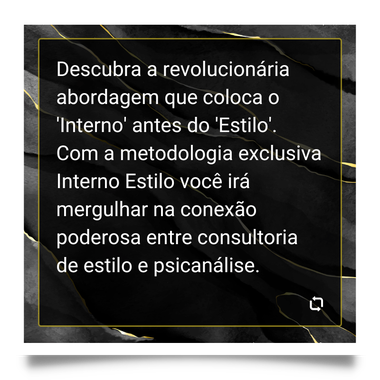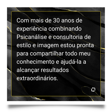 Minha experiência sobre o comportamento humano, que vem da Psicanálise, tornou-se meu diferencial na consultoria. O que torna o treinamento Método Interno Estilo único no mercado, pois foi desenvolvido por uma consultora de estilo e imagem que é psicanalista.