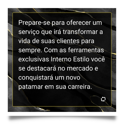 Ajudando você a propor estratégias de imagem mais eficientes com as ferramentas Interno Estilo, aliando sua técnica a práticas de atendimento mais assertivas. Ganha você, ganha a cliente, que se transforma.