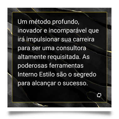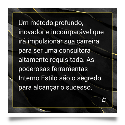1. Descobrir o caminho para se destacar e se tornar irresistível em sua carreira. Com o Método Interno Estilo você vai irradiar confiança em cada atendimento, oferecendo um valor único às suas clientes, transformando a imagem pessoal, estilo e beleza delas. Seja a consultora de imagem que desperta paixões e cativa olhares. Desperte seu poder de sedução profissional e crie um legado de beleza e sucesso!